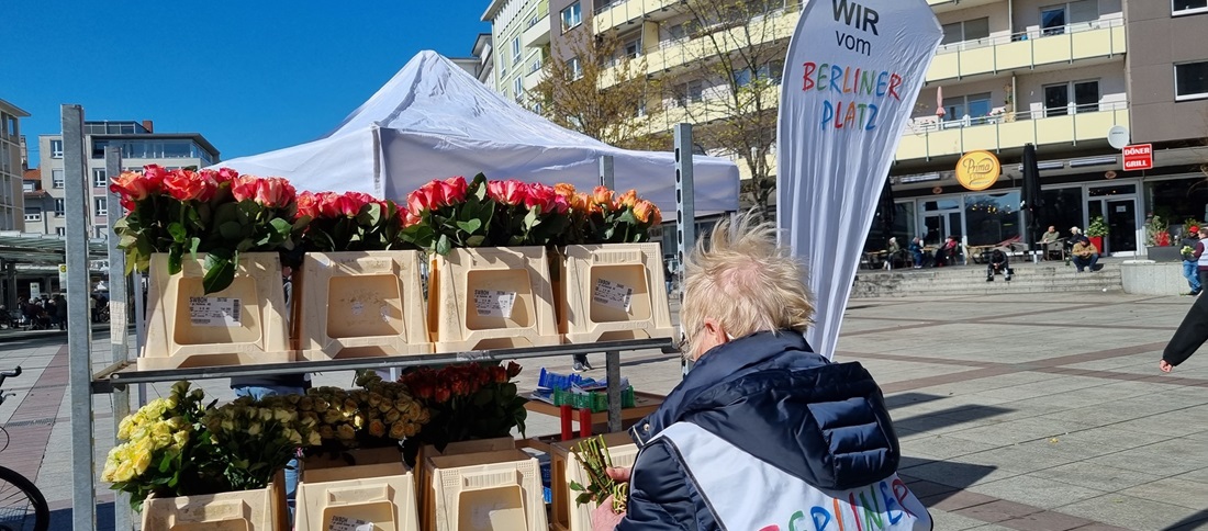 Wir erfreuen Passanten und Besucher auf dem Berliner Platz mit Rosen zum Frühlingsbeginn, bunten Eiern zum Osterfest, Sonnenblumen zum Sommerausklang oder saftigen Äpfeln zum Herbst.