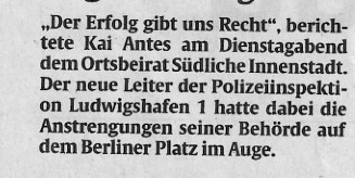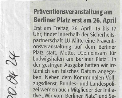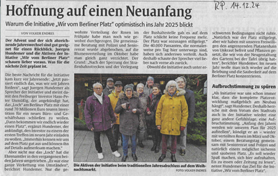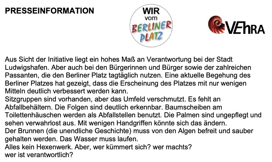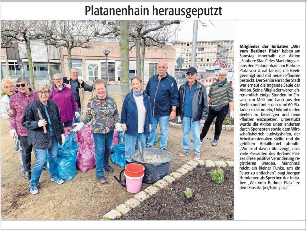 Das Herzstück der losen Vereinigung bilden die Damen des Seniorenrates der Stadt Ludwigshafen unter der Leitung der wieder gewählten „Chefin“ Birgitta Scheib. Unterstützt werden die Aktionen von den verschiedensten Partnern die mit interessanten Aktivitäten auch auf „Missstände“ auf dem Berliner Platz und dessen Umfeld Hinweisen. Sicherheit, Ordnung und Sauberkeit rücken immer mehr in den Mittelpunkt der Gemeinschaft „Wir vom Berliner Platz“. Schon bei der Gründung 2012 wurde hierzu ein Kriterienkatalog erarbeitet. Mit der Polizei und dem Ordnungsamt der Stadt habe man vielversprechende Aktionen u.a. zur Sicherheitslage auf dem Platz durchgeführt. Die Wirtschaftsbetriebe der Stadt Ludwigshafen waren zum Thema Sauberkeit geladen und sind auf viel Verständnis und Interesse gestoßen.
