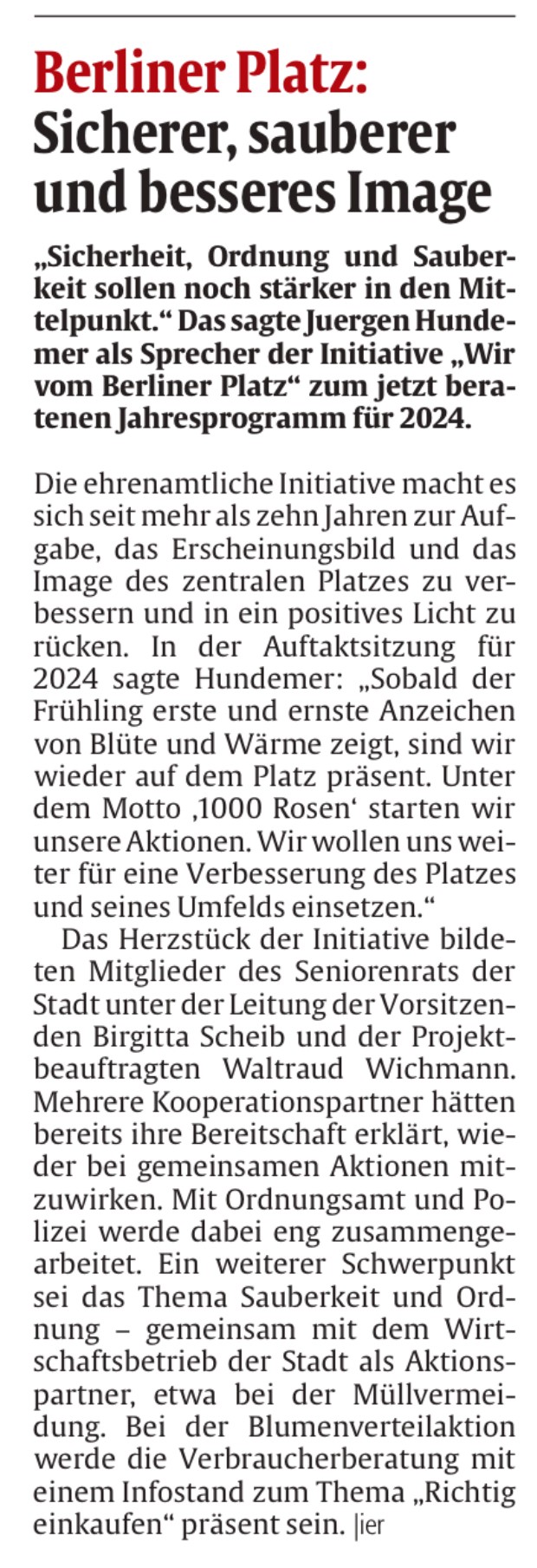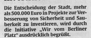 Die positive Weiterentwicklung des Berliner Platzes ist das wichtigste Ziel der Initiative und steht im Mittelpunkt aller künftigen Aktivitäten. Die Zwangspause wegen der Coronapandemie hat daran nichts geändert.