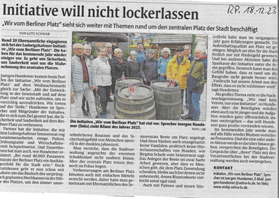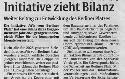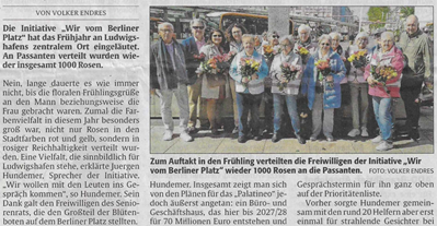 Wir vom Berliner Platz ist eine ehrenamtliche, lose Vereinigung und Initiative in Ludwigshafen, die es sich zur Aufgabe gemacht hat, durch geeignete Aktivitäten das Erscheinungsbild und das Image des Berliner Platzes zu verbessern und in ein positives Licht zu rücken. Seit nunmehr 10 Jahren wirken ehrenamtlich aktive Menschen zusammen, um den Berliner Platz in Ludwigshafen positiv weiterzuentwickeln. Juergen Hundemer ist seit 2018 Sprecher der Initiative und war gemeinsam mit dem ehemaligen Vorstand der Kreissparkasse als Mitbegründer unterwegs. Clemens Schnell konnte leider persönlich nicht dabei sein und hat deswegen mit einem Grußwort die Akteure zum Jubiläum beglückwünscht.
