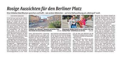 Mehr als 40.000 Passanten begehen jeden Tag aus den unterschiedlichsten Gründen den Berliner Platz und sind wichtige Multiplikatoren, so der Sprecher Jürgen Hundemer in seinem Vortrag. Deswegen ist unter anderem auch das Erscheinungsbild des Platzes von hoher Bedeutung. Die neu gestaltete Sitz Oase ist ein gutes Beispiel für eine positive Darstellung des Platzes und stammt aus einer Idee von „Wir vom Berliner Platz“. Die rege Nutzung bestätigt, dass dies ein richtiger Weg ist Atmosphäre zu schaffen.